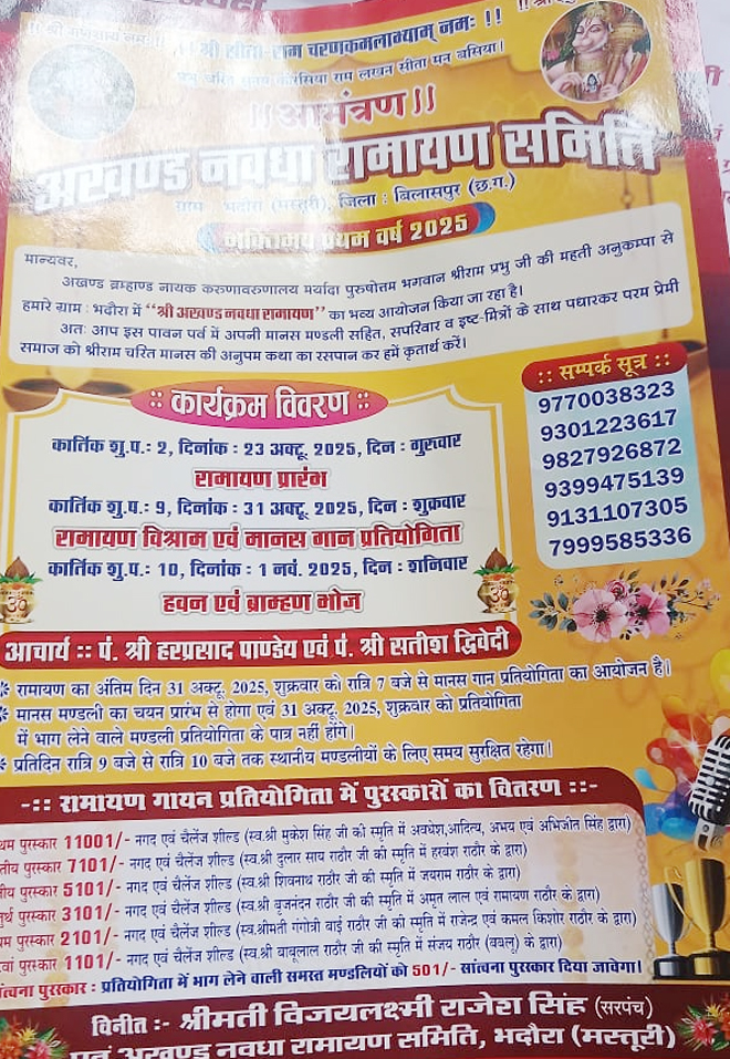 ग्राम पंचायत भदौरा में 23 अक्टूबर से 31 अक्टूबर तक अखंड नवधा रामायण का भव्य आयोजन